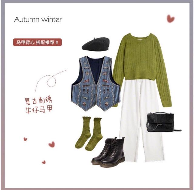绿色作为主色调的搭配,让你就像是秋冬的生机活力代言人!绿色的毛衣和袜子作为颜色的对应,穿搭给人一种细心搭配精妙的感觉。同时毛衣外套选择的是一款蓝色的做旧处理牛仔背心,给人带来满满文艺感。