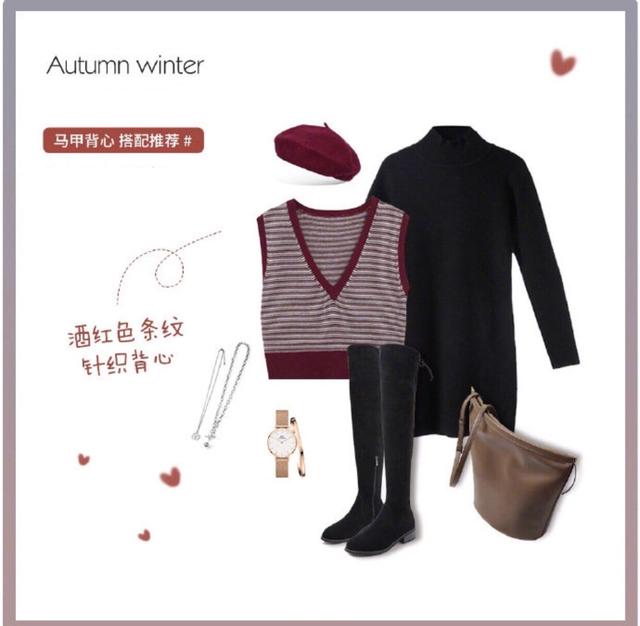 黑色的长款毛衣,设计比较修身,能够展示良好的身材曲线。同时在搭配的时候选择了经典的深红色,红黑色的搭配视觉上相当经典耐看。红色条纹的毛衣背心短款的设计,还能帮你提高腰线,腿看起来更长。
