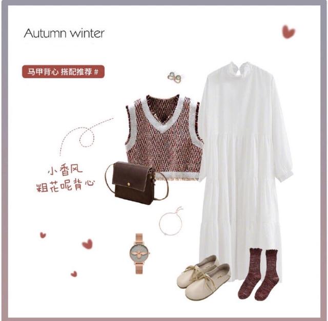 纯白色的连衣裙款式单品,搭配红色的毛衣背心,素气优雅中又有轻熟的味道。白色的皮鞋也是相对比较甜美和优雅的款式,很适合小鸟依人的女人穿搭。
