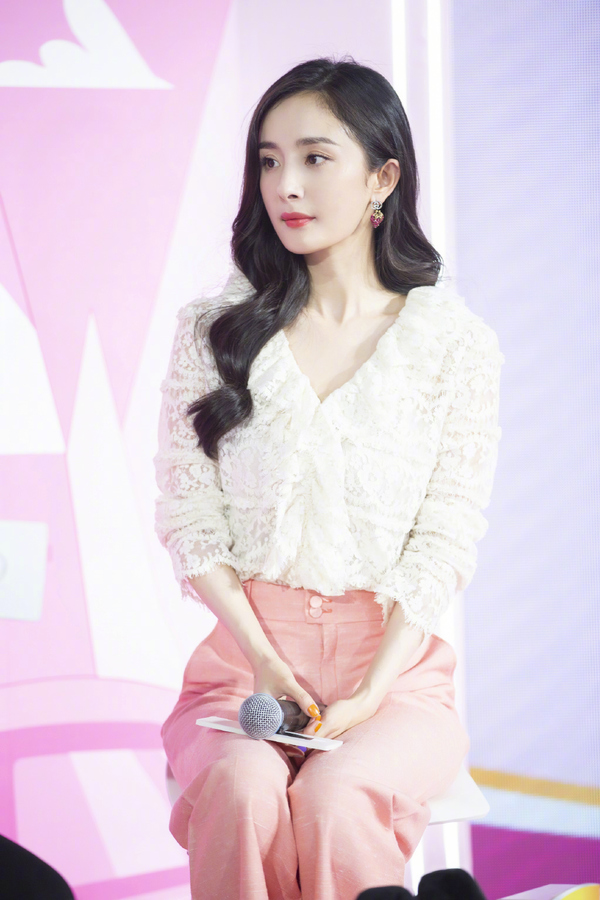 杨幂最新活动造型太美了,白色蕾丝衬衫配粉色阔腿西裤,优雅甜美