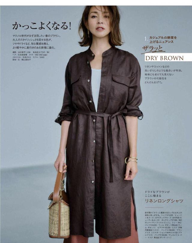 棕色的长款外套是亚麻面料的,特别的清凉。宽松的版型适合在里面搭配一件修身的白色针织衫,裤子选择搭配一件坠感强烈的阔腿裤,从上而下的宽松感和坠落感都十分明显。这样的搭配是日系风格中比较常见的,但却也是最好看和知性温柔的。棕色衣服配什么颜色好看图片