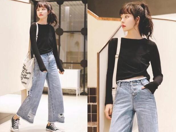 很性感的露脐T恤,适合对自己身材很自信的女生,黑色是很显瘦的色调,短款的设计,露出了小蛮腰,凸显很美的身材,薄款的长袖T恤,不会很炎热感,搭配破洞的牛仔阔腿裤不但显瘦更是时髦,喇叭的裤型,修饰了腿型,优雅又自信,再搭上绑带休闲鞋也是十分好看的。