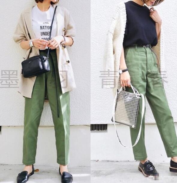 比如今年很流行的工装裤,选择绿色款式,绿色除了显白之外,也很气质,你可以搭配卡其色的短款风衣,搭配平底的小皮鞋,又或者搭配白色的针织衫,尽显温柔。