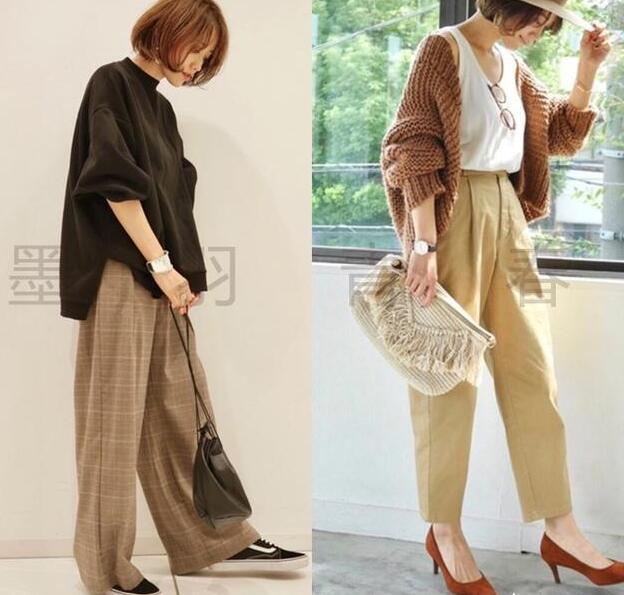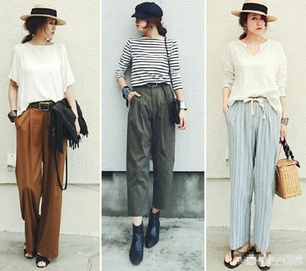 刚才有说到阔腿裤,45岁的女性想要30多岁的感觉,阔腿裤一定不要选择带印花的深色系,不仅不减龄还很老气,一些带有年轻感的纯色系倒不错,遮肉显瘦,搭配小领口的T恤或者条纹衫,非常耐看了。