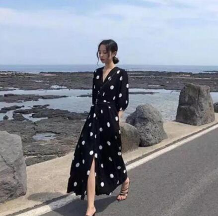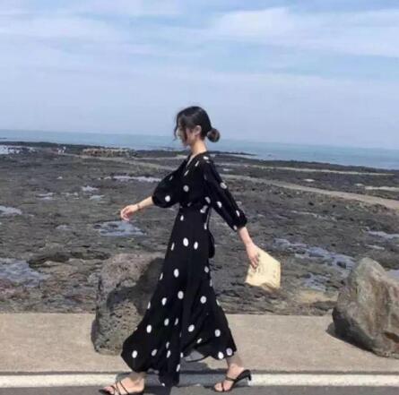 这个黑色的波点过膝裙真的是相当好看了!波点元素一直是时尚圈运用地比较多的一种元素,不管是什么款式,什么材料的衣服,运用上波点元素,都会时髦不少。