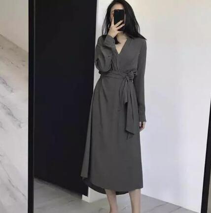 这条过膝裙就显得比较有气质了,有点像大衣的风格,但是这条裙子的灵感主要来源于睡袍,这样说的话大家有没有感觉有点眼熟?虽说像睡袍,但是这款裙子穿上真的是很显气质啊!