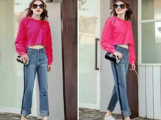 图中这款裤子颜色比起纯黑不算深,腿粗女生适合穿什么裤子?但因是灰色和蓝色做底,因此也归于暗色系列。上身搭配一件靓丽时尚的梨红色,完美贯彻“上明下暗”的搭配法则,粗腿mm们不要错过哦。