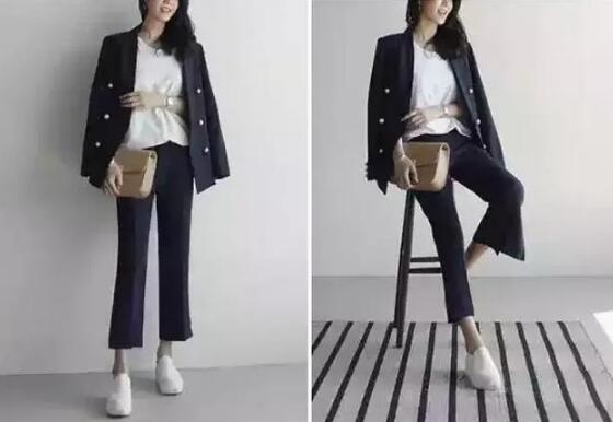 众所周知,西装裤裁剪宽松利落,线条笔直流畅,是一款很能遮肉显瘦的裤子。西装裤最好的选择是配小西服上衣,里面一件白色内搭,外面再挎一个时尚的包包,精致时尚、端庄大气的感觉立刻就出来了,这时还会有谁关注你是否腿粗呢?