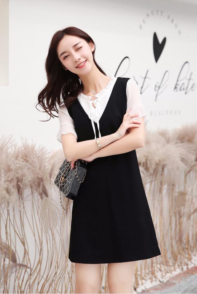 作为拼接创意的新款,即有简约小黑裙的优雅小女人姿态,更能体现连衣裙清新学院风的乖巧模样。不仅修身显瘦的同时,开阔下摆与腰部成形明显的对比,在视觉上给人显瘦的效果更明显,衬托胸部线条更饱满,使其身材的曲线更加的优美。配上荷叶边的V领设计,更能凸显优雅的气质,无论是学生党还是工作者都能轻松驾驭,更显时髦感。