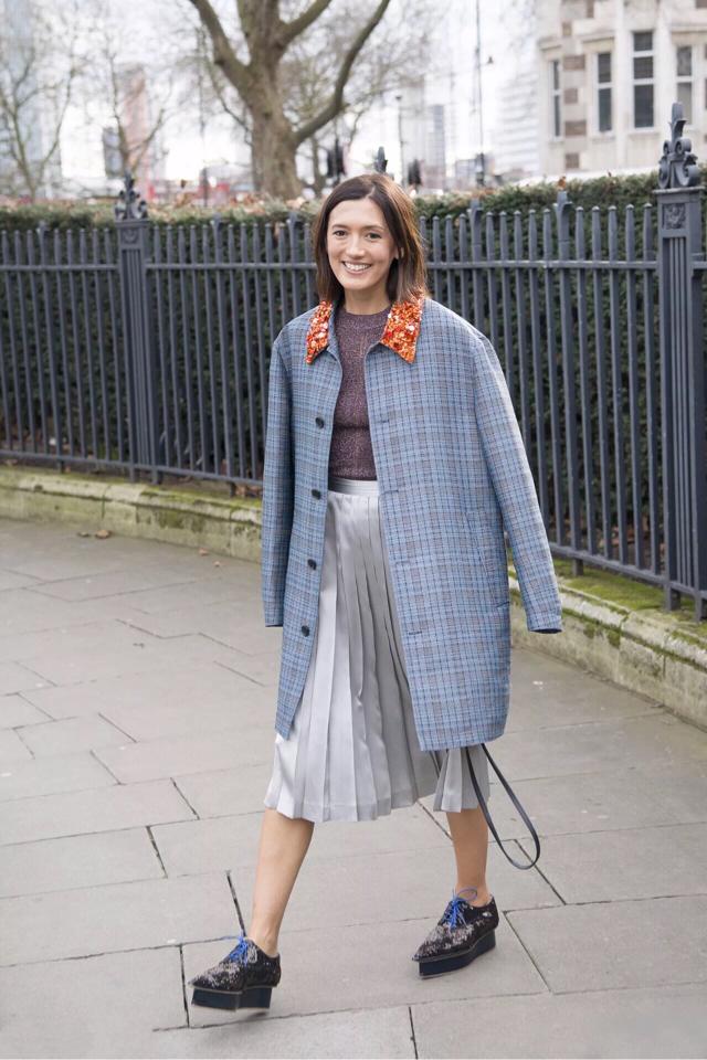 百褶裙一直是时尚圈的宠儿,在日常生活中也常常能看到一些小萝莉喜欢穿格子百褶短裙,百褶裙的款式可不止这一种哦,合适的百褶裙搭配大衣别有一番风味呢。这款银色的百褶裙面料飘逸灵动,搭配蓝底格子大衣显得慵懒随意,纯色的内搭和半裙都选用暗沉低调的色彩,蓝色格子大衣的加持使整体不会显得太过单调,衣长比裙长稍短一些,裙子长度刚好盖到膝盖一下,露出修长的小腿曲线,比起宽松肥大的阔腿裤更显身材。