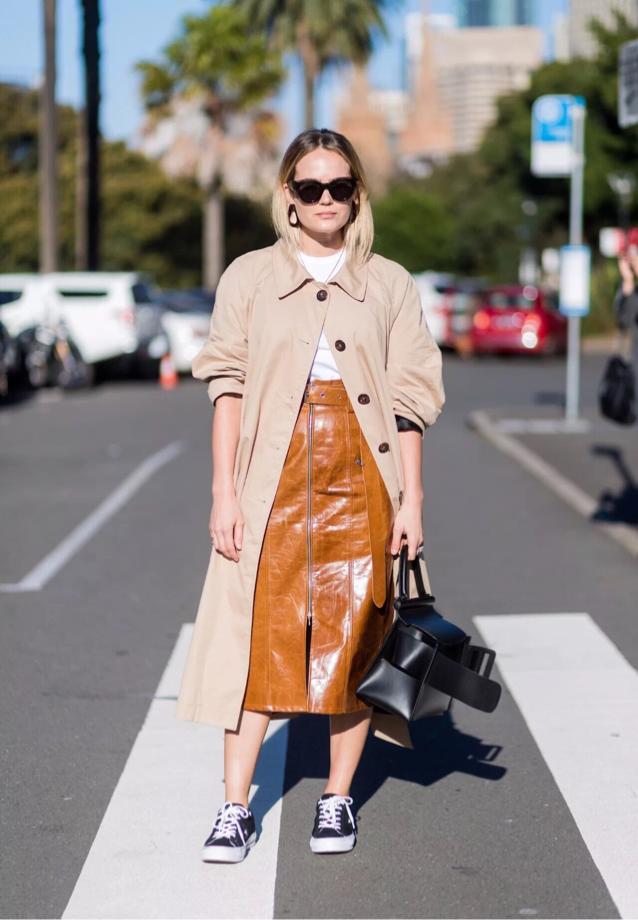 除了常见的黑色皮裙,其他颜色的皮裙似乎很少见,很多人认为彩色的皮裙太过花里胡哨,很难穿出时尚感,其实这种看法太片面了,彩色皮裙的新鲜感往往更加深入人心。当杏色的大衣遇到棕黄色的皮裙,颜色融合的恰到好处,色彩搭配介于亮眼和暗淡之间,高腰的皮裙有效拉高身材比例,显高显瘦作用完全不输于阔腿裤,适合下半身偏胖的妹子,裙子前段开叉的设计给时尚效果加了不少分,完全不会担心撞衫哦。
