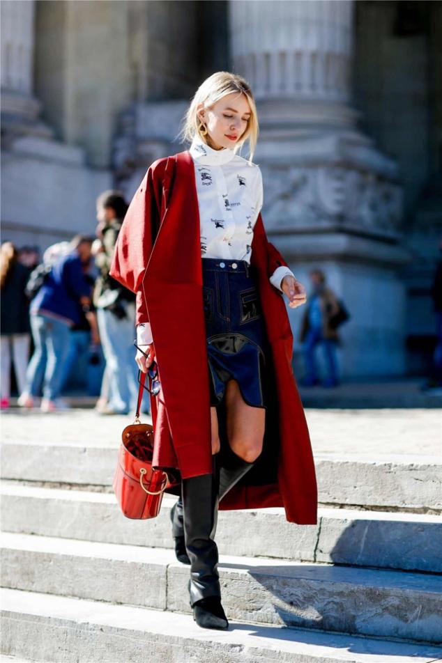 以上所说都是大衣和中长款以及长款半身裙的搭配,其实短裙和大衣的搭配同样可以穿出时尚感,甚至比长裙更具新鲜气息。半裙还比阔腿裤显高显瘦,时髦程度也不在一个档次黑色短裙搭配红色大衣是红与黑的撞击,两者都是皮质材料,光泽感十足,略显随意的穿搭显得时尚感爆棚,长度到膝盖的黑色长靴瞬间感觉气场一米八,突显腿长优势。
