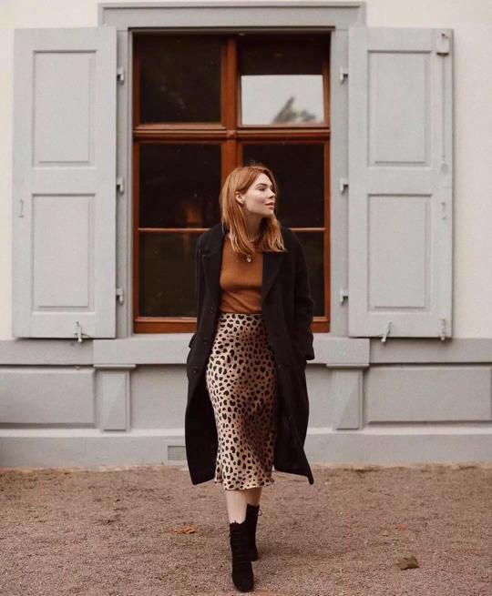 每年都有新的流行元素,豹纹便是今年热度不断的流行元素之一,这款豹纹的半身裙也是柔软亲透的面料,丝滑柔顺显得高级感十足,并且有效勾勒出身材曲线,搭配最经典的黑色大衣,显得成熟又优雅,而如果搭配阔腿裤就完全体验不到这种感觉,豹纹的张扬野性和黑色大衣的低调形成鲜明的对比,两者巧妙结合,由内而外的展现衣品的魅力,脚上黑色的短靴和黑色大衣相互呼应。