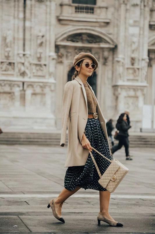 与其他的裙子不同,印花裙的款式多的数不清,大衣和印花裙的搭配也能穿出时尚感,米的的大衣常见且百搭,甚至可以说是烂大街,如果搭配阔腿裤肯定太过普通,一下就被埋没在人群中了,而这款黑底白点的波点裙和米色大衣却给人一种眼前一亮的感觉,似乎让大衣都重获新生,看起来不似以前那么普通了,腰间棕色的皮带加强这身搭配的时尚感,显得更加精致,妹子们可以get 起来了!