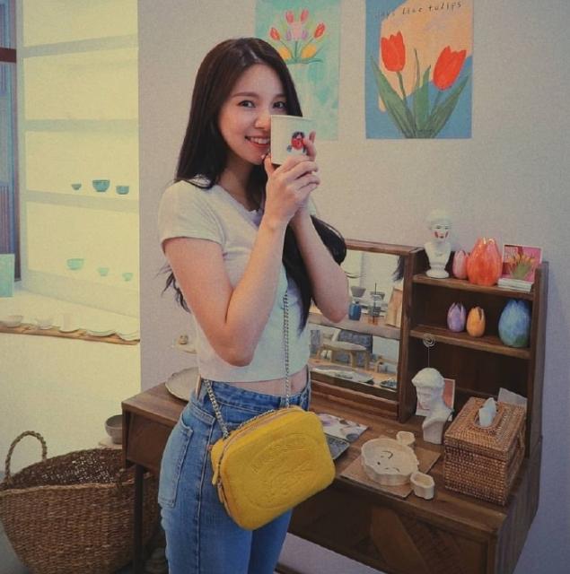 T恤+牛仔裤这样的搭配是很普通的搭配,但是配上小姐姐精致的颜儿与火辣辣的身材,却能让人为之心头一颤~整个look的色调搭配也很简约、干净,清新的白色、蓝色给人以纯粹自然地质感,清新气息扑面而来,再用黄色小包作为点缀,整个搭配甜美温柔又可爱。