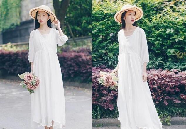 春夏天还是最流行穿白色连衣裙了,高腰的版型设计,加上V领的领子设计,可以完美缩短了上半身的曲线,完美秀出你的好腰线,拉长你的身材比例,还有那最有仙美feel的雪纺裙摆,在微风中随意的吹拂着,看起来是那么的美腻,那么的有仙女feel呢。