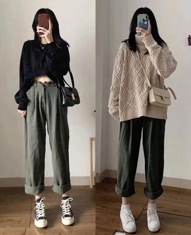 工装裤的设计风格显得很沉稳复古,搭配挽裤脚设计十分有时尚感,同时九分裤绝对是显腿长的神器。这样的版型和设计搭配短款卫衣,有一种个性女人的感觉,而搭配中长款宽松毛衣,则相对更像是邻家女孩和文艺少女的风格,这些穿搭,比较适合高个子女人。小个子女人穿高腰裤和短上衣更适合。