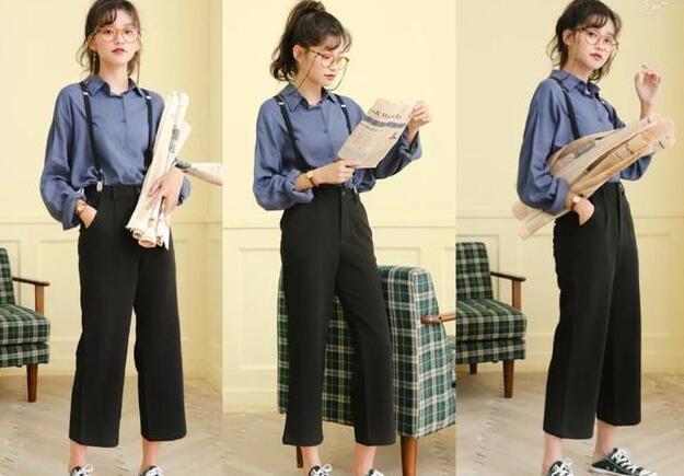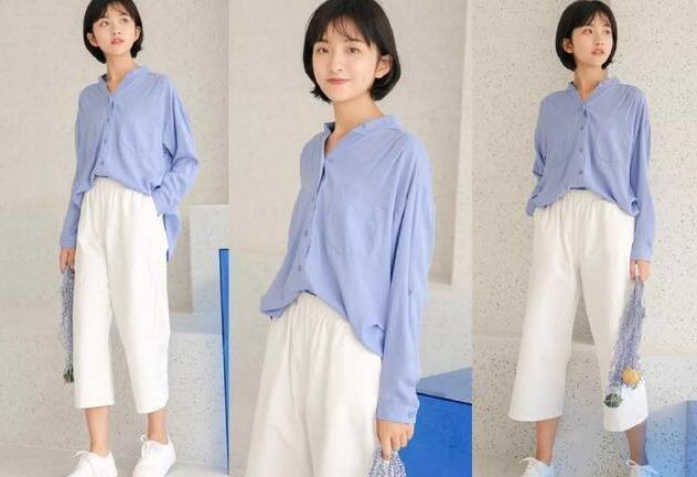 春季穿上蓝色的V领衬衫,不但小清新感十足,还特别显白,V领的设计,很修饰脖颈,展现很美的脸部轮廓,休闲的学生版型,超级文艺,制造一种清纯之美,配上白色的阔腿裤还特别显瘦,上身不仅能够巧妙的遮住我们整个下半身的肉肉,不管是大屁股、大粗腿还是肌肉小腿,穿上它都能分分钟帮我们隐藏起来,再把衣角塞一塞,再配上一对运动鞋很显高又舒适哦。
