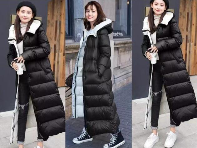超长款设计的黑色羽绒服,是冬天最百搭的款式,比较适合高个子的女生,可以轻松穿出好看的造型来,还满满的气场感,而内外撞色的设计,增加层次感,还很吸睛的呢,而羽绒服的材质,更适合寒冷的冬天穿着,想要温暖轻而易举了,超长的版型,轻松隐藏住你身上多余的肉肉,视觉上就很显瘦的了,搭配黑色破洞牛仔裤,这么穿真的很潮很时髦。
