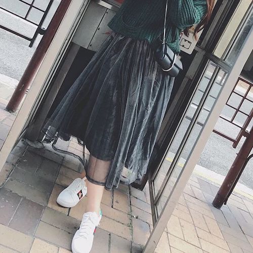 这款裙子的款式是长款的设计哦,裙子可以穿到小腿肚的位置,这样的裙子冬天穿起来非常的美哦,将裙子的腰部穿高一些还可以起到一定的提高腰线的作用,腿看起来也就会显得又细又长哦。它的外部还有一层网纱的设计,有一点亮亮的感觉。