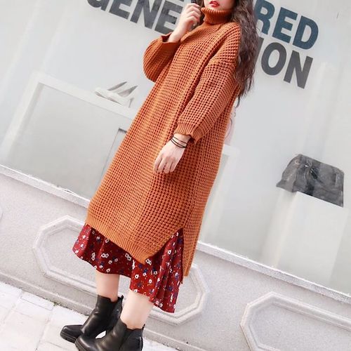 这款连衣裙的款式针织效果非常的棒,一节一节的针织线条为裙装起到了很棒的点缀效果,下摆有一个小小的开叉设计点缀,连衣裙是高领的设计哦,穿起来非常的保暖呢!
