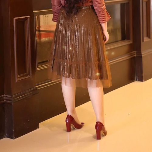 这款半身裙的款式有一点点复古的感觉,外部也是带有网纱的设计,加上这款半身裙香槟金的颜色,在灯光的照耀下会显得非常的亮眼哦,穿在身上一定非常的显示气质。