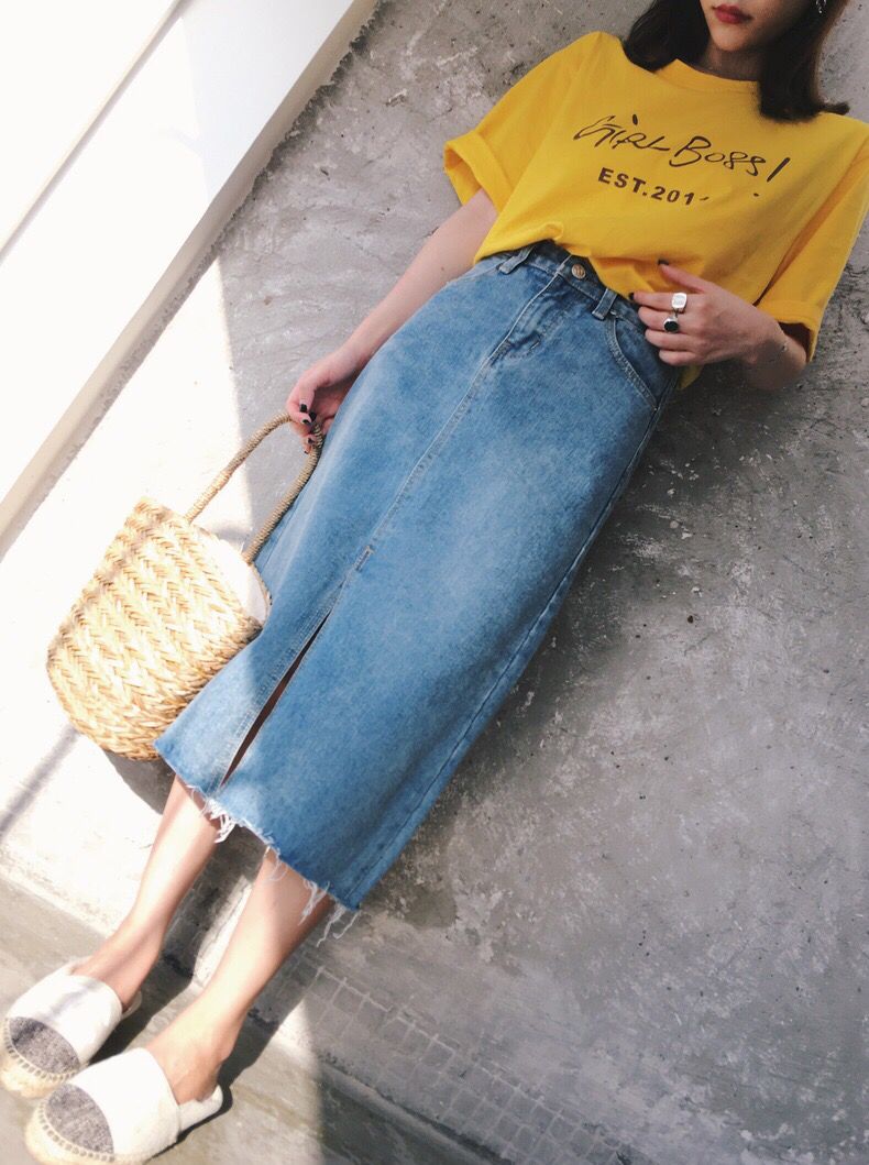 这款长款牛仔裙也并不挑人哦~整体略微宽松,有些小A字的版型,高开叉的设计对身材的包容性更好,穿起来也比较休闲随意,而且很显瘦,搭配一件姜黄色或者是颜色鲜艳的T恤,就是充满活力的时尚girl哦~别再让衣橱里的必备单品们长毛了,快关注账号跟着小编一起来学学穿搭技巧,美美的度过每一天吧~暴热天出去浪,告诉你怎么最时髦?