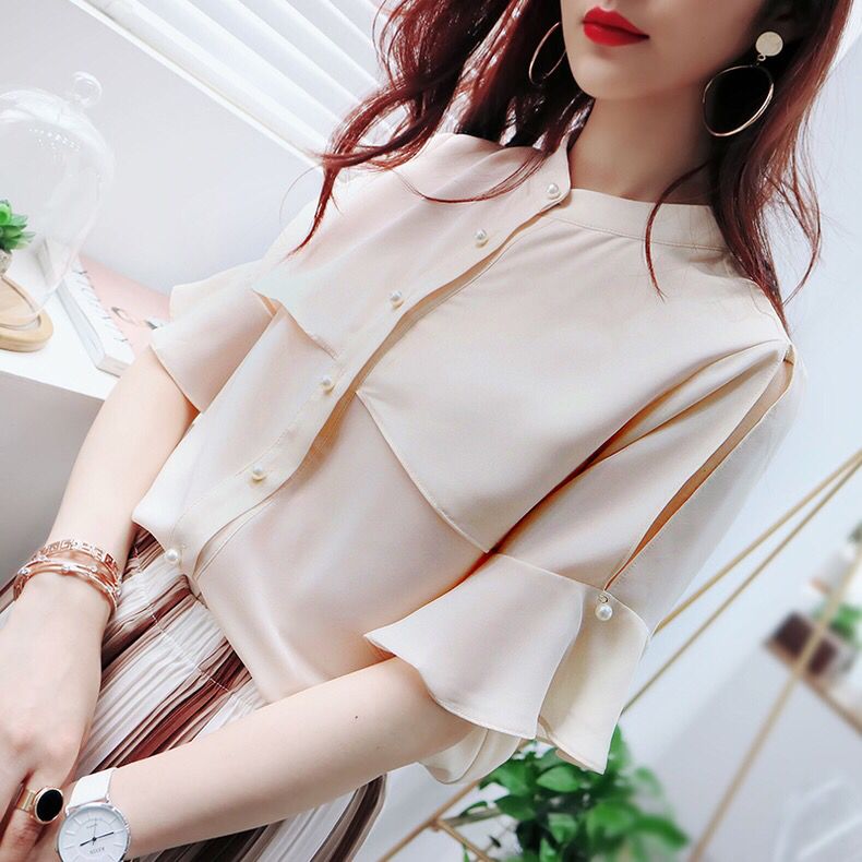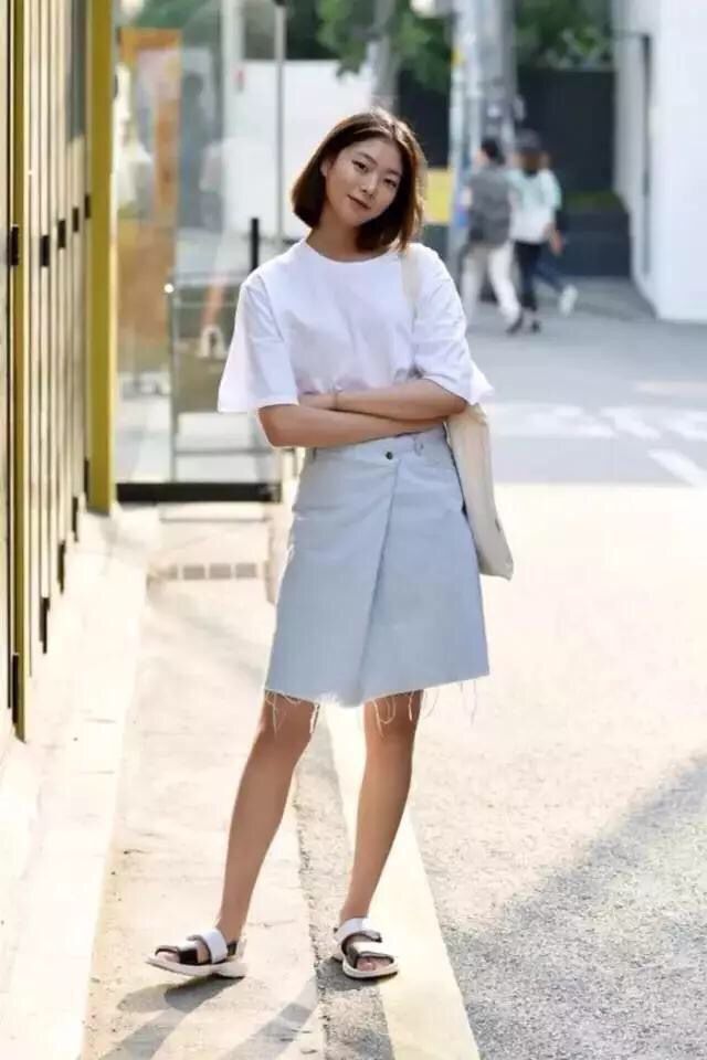夏日的衬衫当属雪纺首选,七分堆叠的袖子能够巧妙的遮住胳膊上的小肉肉,豆沙粉的小圆领设计,适合淑女气质的小仙女进行搭配,大长波浪发跟这个气质很是合拍。【T+牛仔半裙】T+牛仔半裙,想必是每个小仙女都或多或少尝试过的组合。一件基础款牛仔裙,就可以将各类流行T一网打尽,无论是简单的纯色T,还是充满印花的潮流T,一双运动鞋,足以元气满满活泼青春。