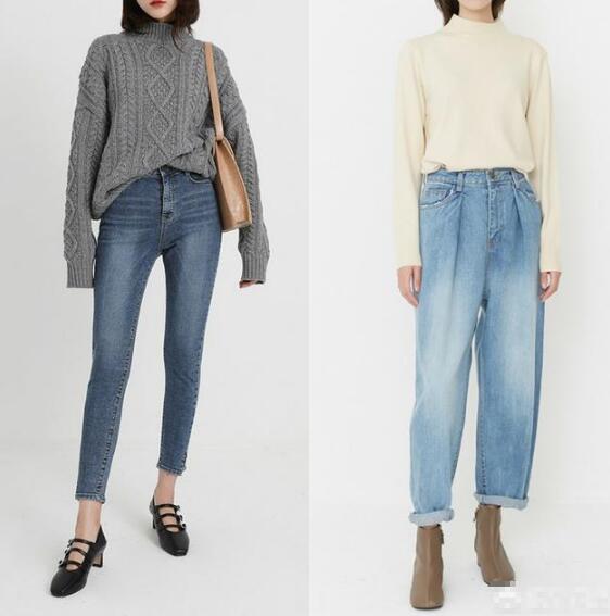 简约的小高领能呈现纤细的脖型,显得脸小,(左图)粗纹理的麻花针织毛衣更具廓形感,搭配修身牛仔裤更有利落休闲的味道,在不太冷的南方地区可以直接搭配单鞋出门,而(右图)面料细腻的高领毛衣款式则显得线条流畅一些,浅色的搭配会看起来很干净舒服,做内搭搭配外套会给人温柔的感觉。