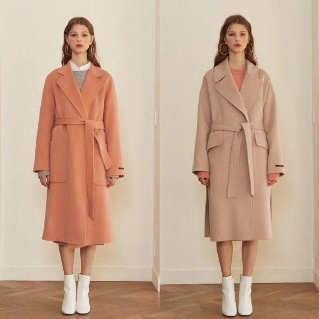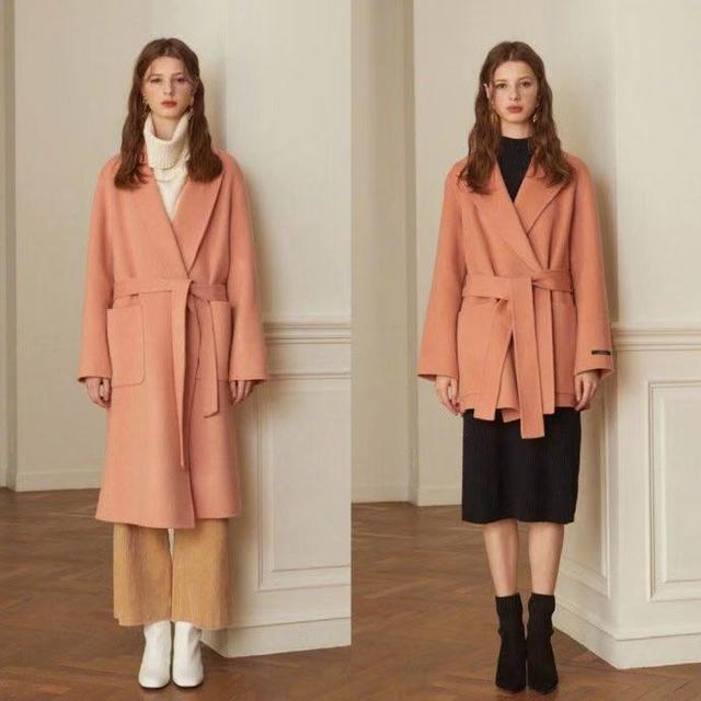 橘色系的浴袍式大衣,颜色十分的柔嫩。像这种比较有色彩的服饰在搭配上尽量选择比较基础简单的颜色,比如黑色和白色简单百搭,而且还不会出错,长款的浴袍式大衣搭配白色高领毛衣,休闲温柔,再搭配一条土黄色的等行人宽裤,十分的时尚简约,色彩的搭配上给人一种非常温柔的感觉。而短款的大有搭配黑色连衣裙,多了几分的沉稳,又不失活力。