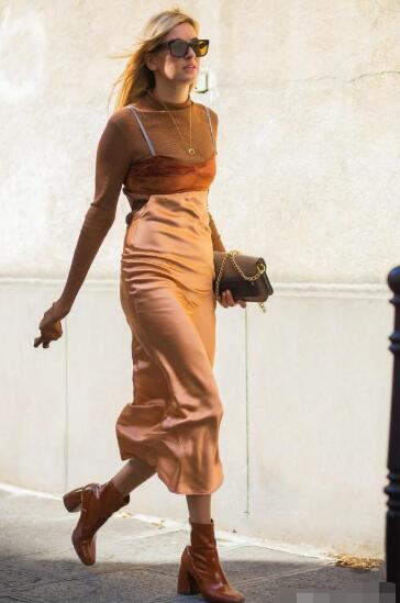 睡衣风格的吊带长裙你的衣柜里居然还没有一条吗?金丝绒+绸缎的拼接材质显得质感满满,香槟金色完全就是秋天的完美色彩,内搭一件同色系的焦糖色紧身半高领打底衫,呈现叠搭层次感,一双焦糖色粗跟短靴露出一截纤细的小腿,显瘦100分。