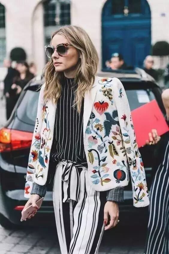 在冬日里穿多了纯色大衣,到了春意盎然之时,换件印花外套换种心情~印花西装打破了以往清一色西装的沉闷感,正式感没那么强烈,反而多了一份活泼气息,非常适合上班族!大胆玩时尚的妹纸,可以选择条纹单品来搭配,条纹针织衫,条纹阔腿裤,看似浮夸的混搭,却能产生意想不到的摩登效果!