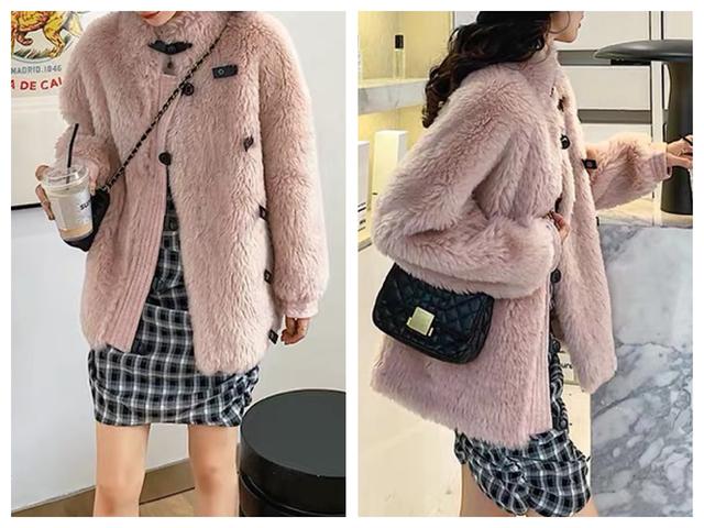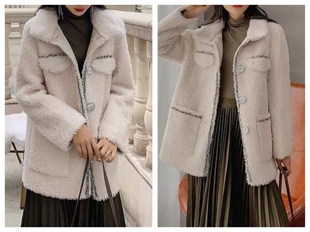相对于一般的羊羔毛外套来说,这款更加具有淑女气质,侧面下摆的小弧度设计真的好洋气哦,口袋和衣襟处的滚边花边设计也很好看,增加了一点小俏皮的感觉,领子扣起来整个脖子都是毛绒绒的~降温天超级保暖!