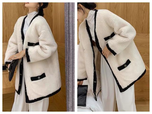穿上高级感立现,女神都值得拥有,白色带一点点仙气小香风,黑色的绣花刺绣边边看上去非常有档次,简单优雅色系黑白成熟魅力的韵味,时尚,整体款式很简洁,可以说是很有高级感的一款冬季羊羔毛外套了。