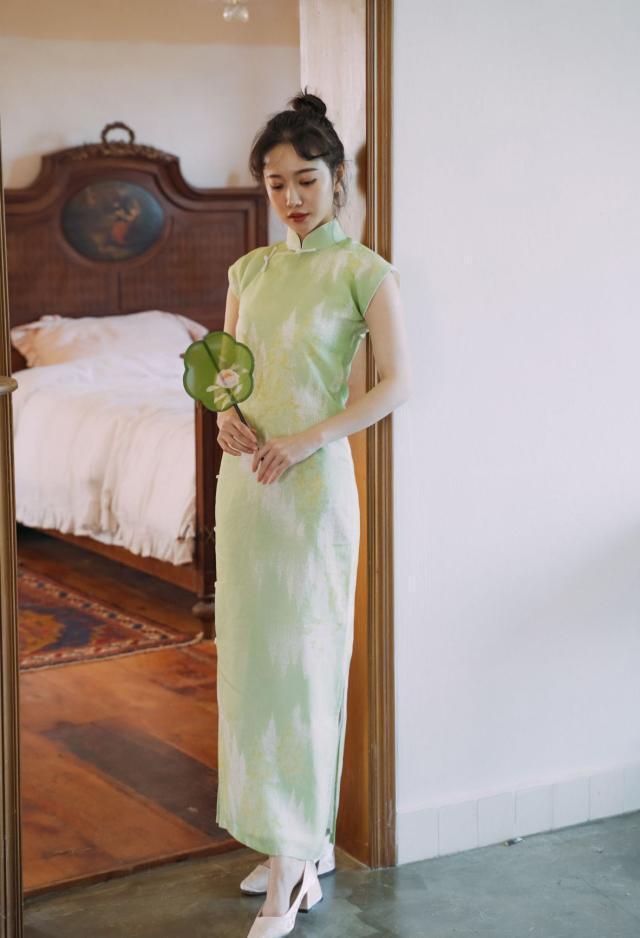 清新的绿色,视觉上让人眼前一亮,氤氲着少女的清纯与秀美,充满了春天的气息,白色与锈黄色的印花平添了视觉层次感,不至于那么的单调,意境幽深,旗袍连肩袖的设计修饰了肩型,更带出时尚与少女的韵味,裙摆开叉典雅含蓄,行止间摇曳出无尽的魅力与风情来。