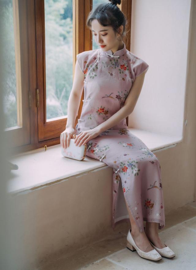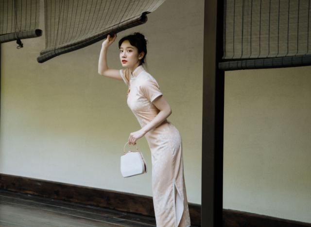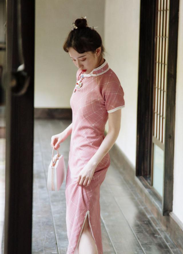 粉色的旗袍甜美温柔,一如少女的心思,瞬间将人衬托得温婉起来,交织的线条流动着岁月的痕迹,又宛如星空般梦幻而美好,旗袍线条柔美,立领、盘扣、斜襟,无一不带着中式的典雅,胸花点缀更添雅致高贵,含蓄的开叉媚而不俗,整体给人一种惊艳了时光的美。上一篇:奶奶裤潮流搭配图片下一篇:个矮腿粗的女生适合穿什么裙子和裤子,穿衣搭配技巧