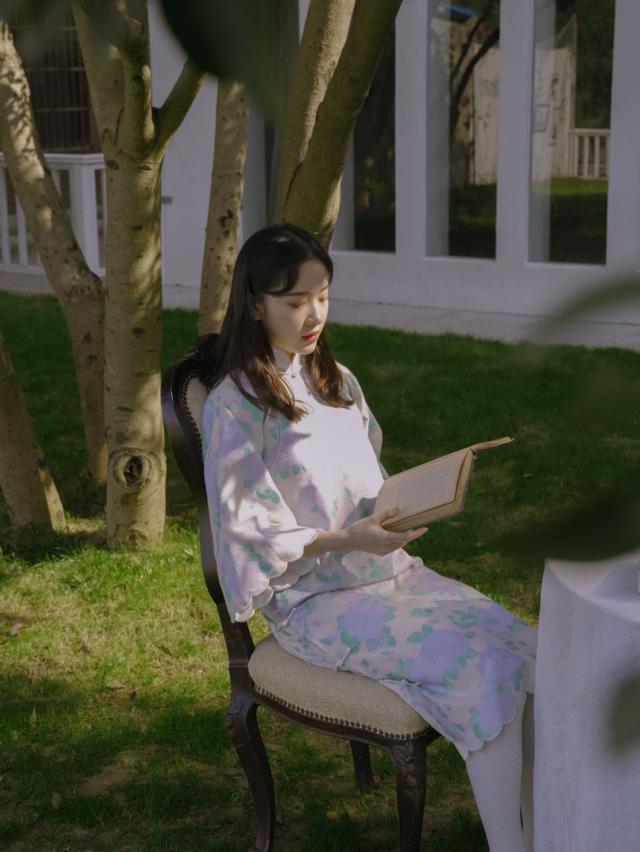 烟紫色的印花旗袍,古韵浓郁,淡淡的紫色唯美又温柔,如烟如雾,奠定了整体的气场,惊艳的印花丰富了视觉,跳跃着明艳又俏丽的少女风情,旗袍勾勒出女子柔美的身姿,精美的盘扣沿着侧襟依次点缀,灵动盎然,在开叉处流泻出一丝性感,气质独特。