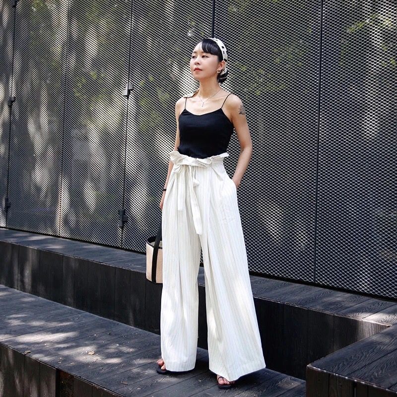 超大的阔腿甩裤,白色的条纹显得清爽又高级。超宽松的裤腿,不光是显瘦拗范的一把好手,看上去气质随性洒脱! 加上自带焦点的花苞高腰系带造型,上身搭配短款上衣,就很简洁大气,变成时髦高瘦大长腿,时尚服装。在人群中自动超吸睛!