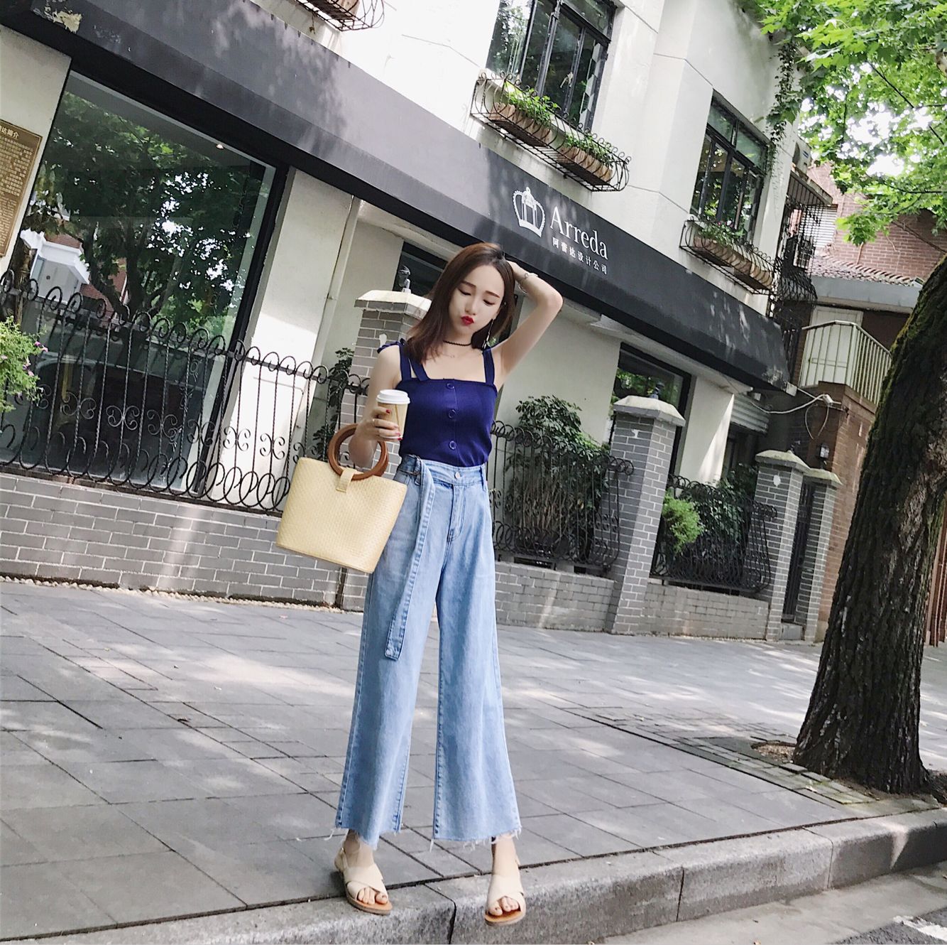 这种阔腿裤就是我们平时最常见的阔腿裤了,小编觉得这种阔腿裤不管身材胖瘦都尽量选择稍微宽松一点的。直线型牛仔阔腿裤算是一种非常复古的时尚了,个子高的可以选择平底鞋,个子稍矮的可以配双高跟鞋。