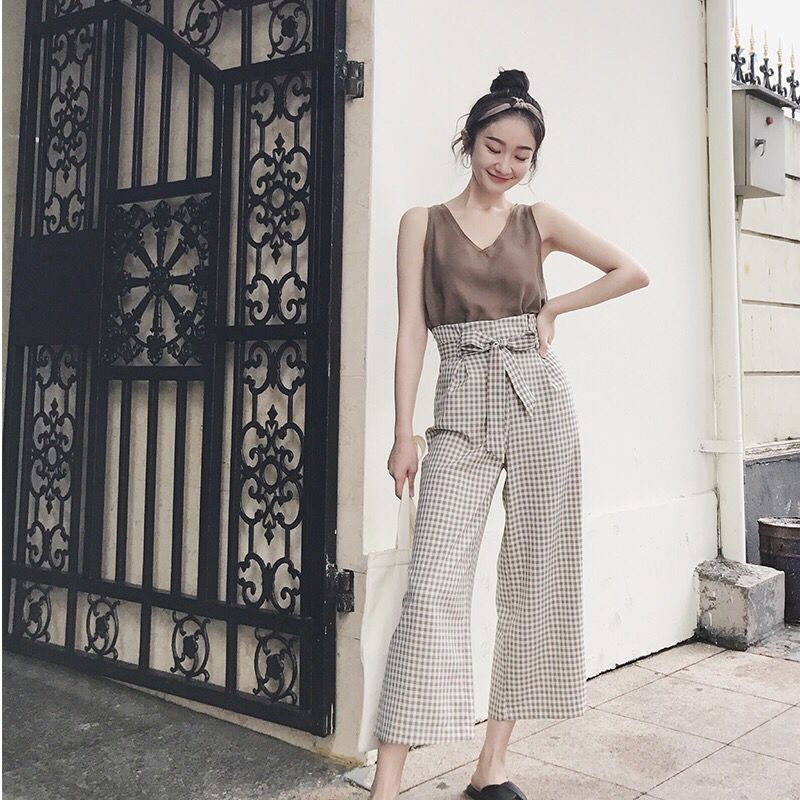 这款格子裤版型上是一个阔腿裤的廓形,而且是小格子,这样就不会显得很复古。花苞造型的裤头,增加了活泼俏皮感。