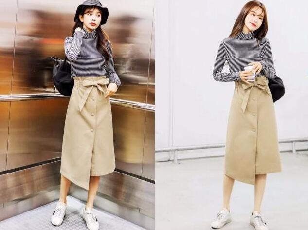 这款半身裙是今年最新款又是最流行的款式,卡其色又是复古的元素,很受欢迎哦,腰带系蝴蝶结设计,甜美范十足,单排扣的设计版型,优雅大方,裙摆不规则的设计,整体来看时尚美观,上身搭配高领的斑马纹打底衫,贴身的版型设计,修饰纤细的身材,显高挑显瘦,太美了。