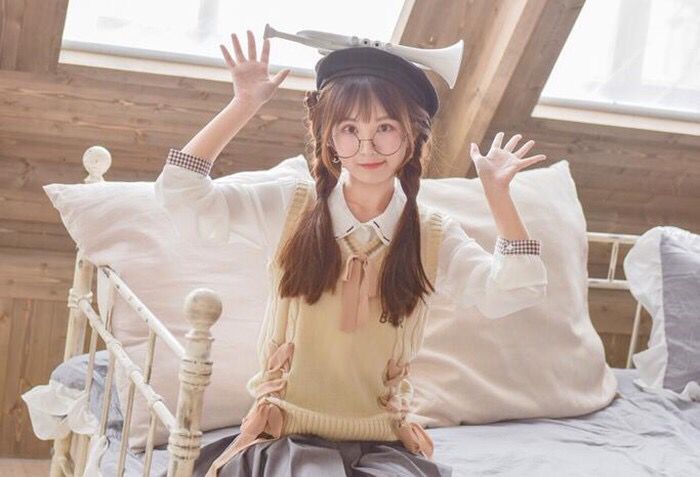 如果觉得开衫不够洒脱,可以搭配条纹式V领的毛衣背心,学院风更加浓厚,绑带和卡通贴布细节也是给足糖分,超甜~