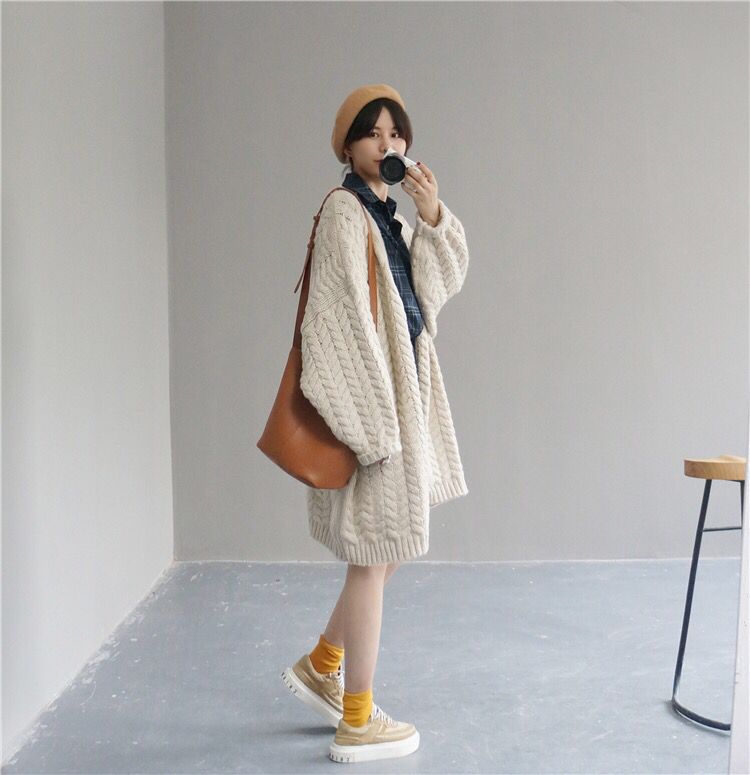 这是一件高个小个都能穿出气质的针织开衫,麻花针织显得复古文艺,宽松的慵懒风格包裹住小个子妹子,衬托出她的娇小可爱,当然啦,高个子女生穿上瞬间气场大开,韩范十足。