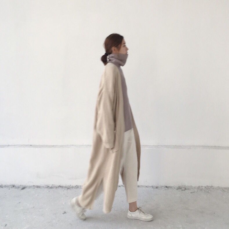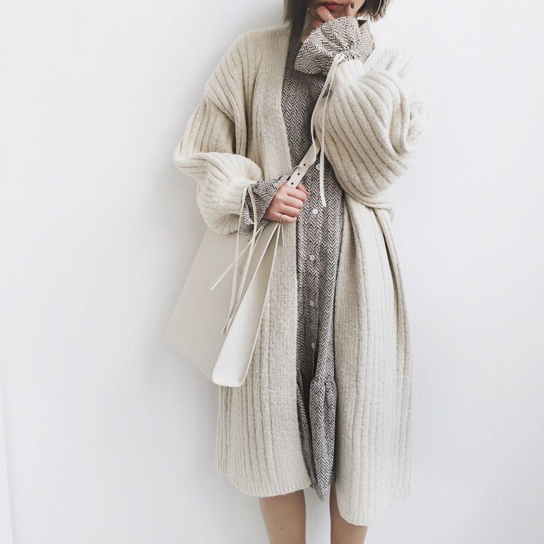 很简单的一件开衫,杏色干净清新,深灰色百搭修身,竖纹理加上灯笼袖的袖口设计都十分韩范,超有文艺风,长长的款型内搭可以选择连衣裙或是衬衫都是十分仙气十足哟。