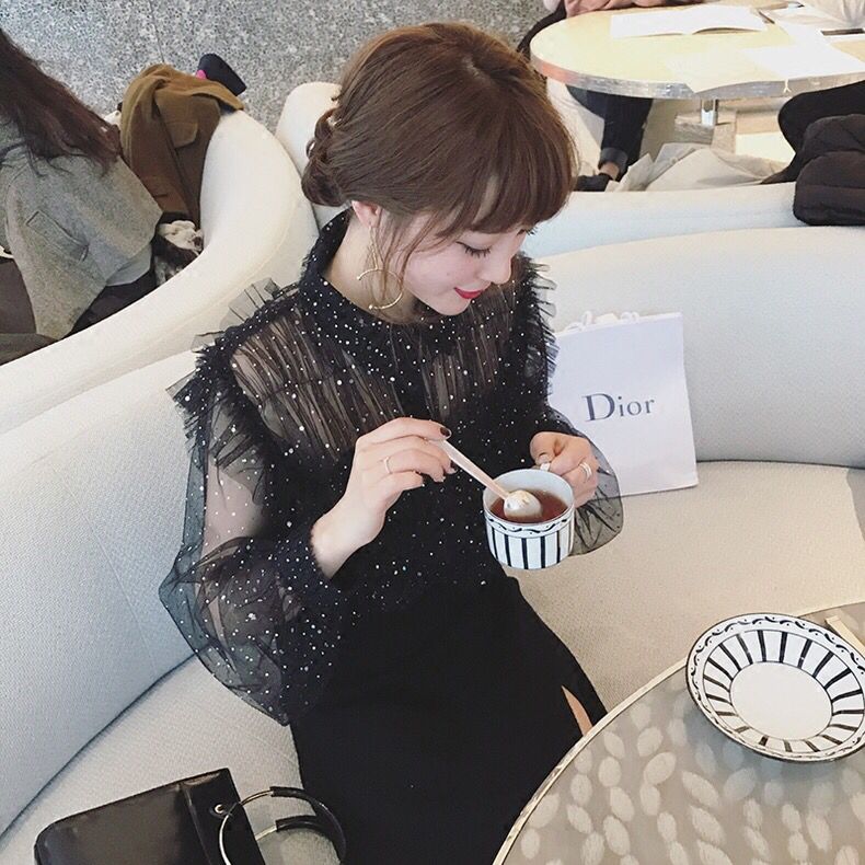 炒鸡让人惊艳的衬衫,在灯光下简直闪闪发亮,黑色配上发亮的闪粉,瞬间就变得高大迷人了,让人移不开眼,似有若无的网纱诱惑才最为性感,绝对是斩男款啊,简直是太美了。