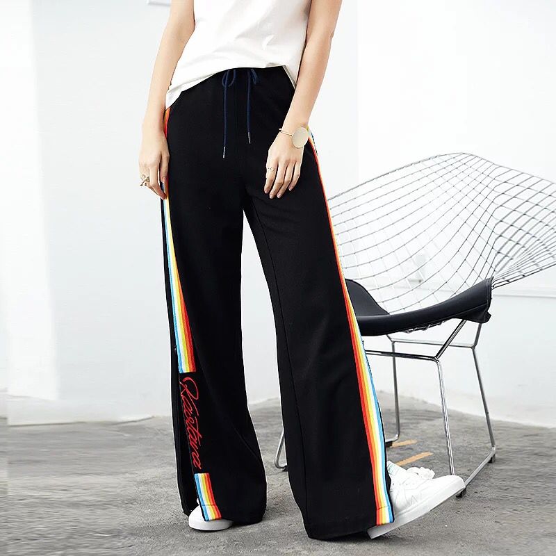 修长的裤型分分钟穿出大长腿,侧边的织带装饰更是将视觉延伸到无边界。红色用的白色细带,对比清爽,黑色款则用的彩虹色织带,更能突出颜色的对比。裤脚的字母印花更是细节满满。裤脚做了隐拉的设计,可开叉也可不开。搭配上简约的字母T就是一位时尚潮人。