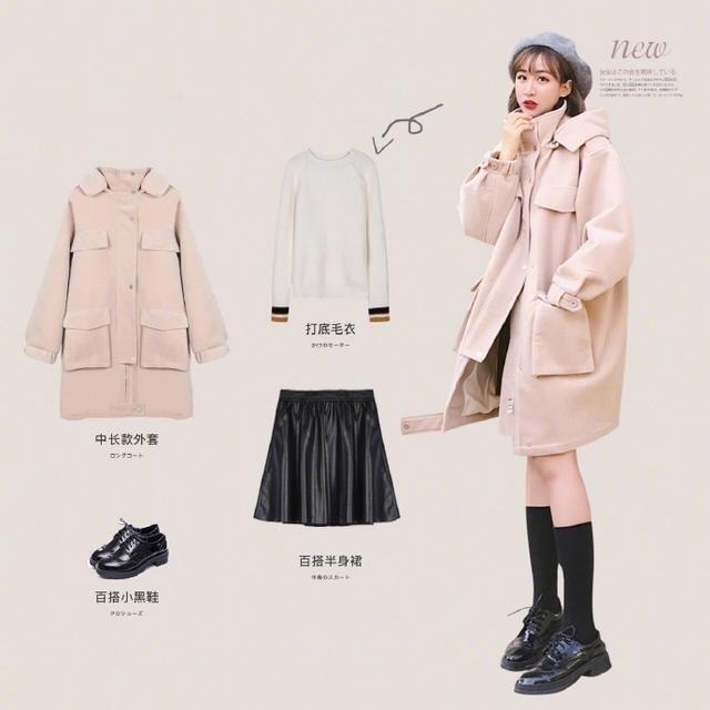 淡淡的米色很优雅,像一杯柔顺爽滑的奶茶,散发着高雅、柔美的光华~外套的设计很立体,中长款是,不但可以很好的修饰身材显瘦,企鹅也能更好地露出腿部,即使是小个子女生也可以穿的很好看!内搭毛衣+皮质百褶裙,俏皮可爱~贝雷帽作为点缀,还巧妙地运用了撞色,更有文艺气息。