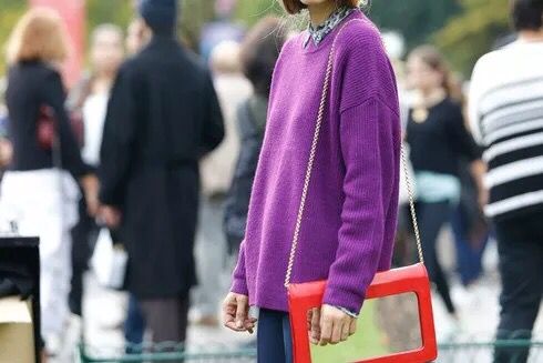 撞色的搭配也是今年很时髦的搭配方法,紫色跟黄绿色系为完全对比色。撞出的效果真的惊呆,个人感觉和姜黄的感觉胜于亮黄。