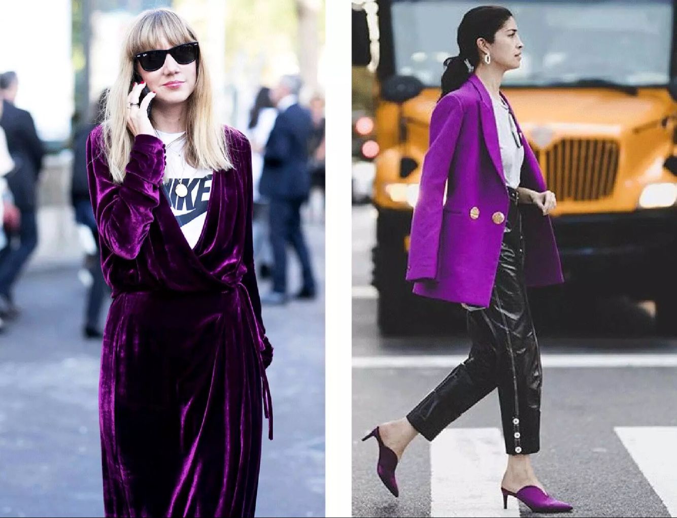 红色与紫色是邻近色,它们搭配起来自然也是很和谐的,上身大面积紫色的时候可以加一点红色,显得非常亮眼不突兀。