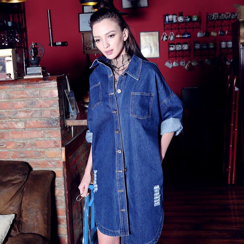 这款外套完全就可以当裙子来穿了,衣服的下摆是不对称的设计,很有层次感,衣身上加了破洞的元素,更显时尚,将袖子挽起来更加的干练和帅气了。